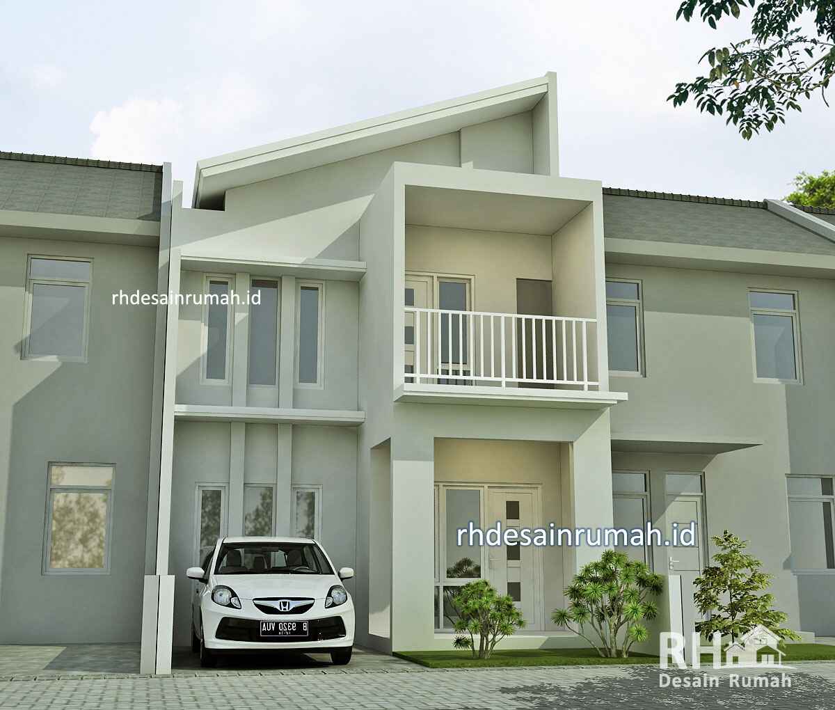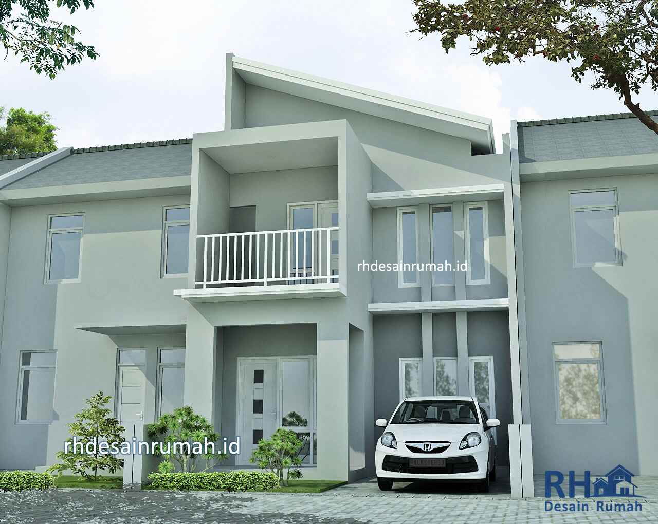 Rumah dengan atap miring dan bentuk kotak pada bagian balkon ini cukup unik dan menarik.
