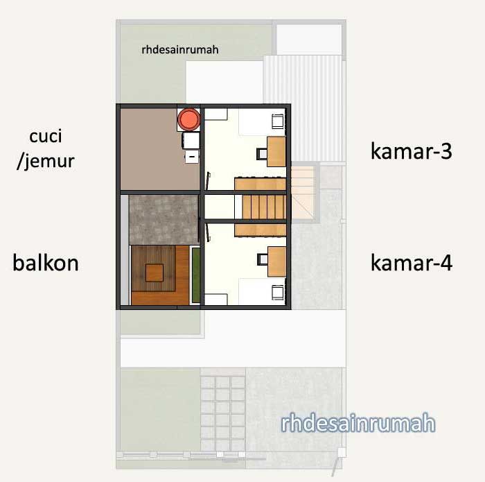 Selanjutnya, naik ke bagian lantai dua, diisi dengan 2 kamar tidur untuk anak, tempat cuci/jemur, dan balkon.