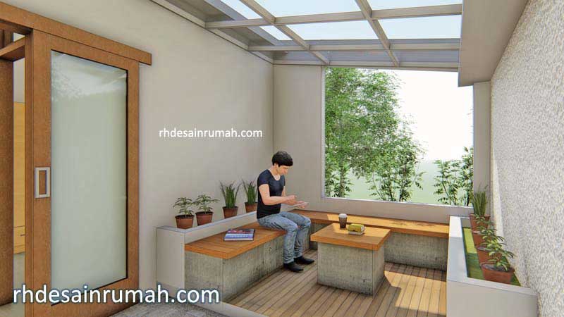Untuk menambah kesan sederhana dan natural, balkon dilengkapi dengan berbagai tanaman hias dan aksen kayu sebagai lantai maupun tempat duduk.
