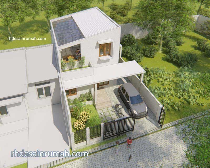 Tanpa konstruksi atap genteng, desain rumah minimalis modern kali ini menggunakan atap gelombang non asbes yang dipercantik dengan atap skylight pada area balkon.