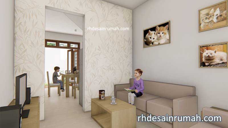 Ruang tamu yang simple juga difungsikan sebagai ruang keluarga, diisi dengan perabot seperlunya sesuai dengan fungsinya masing-masing. Pemilihan sofa dan furnitur disengaja polos.