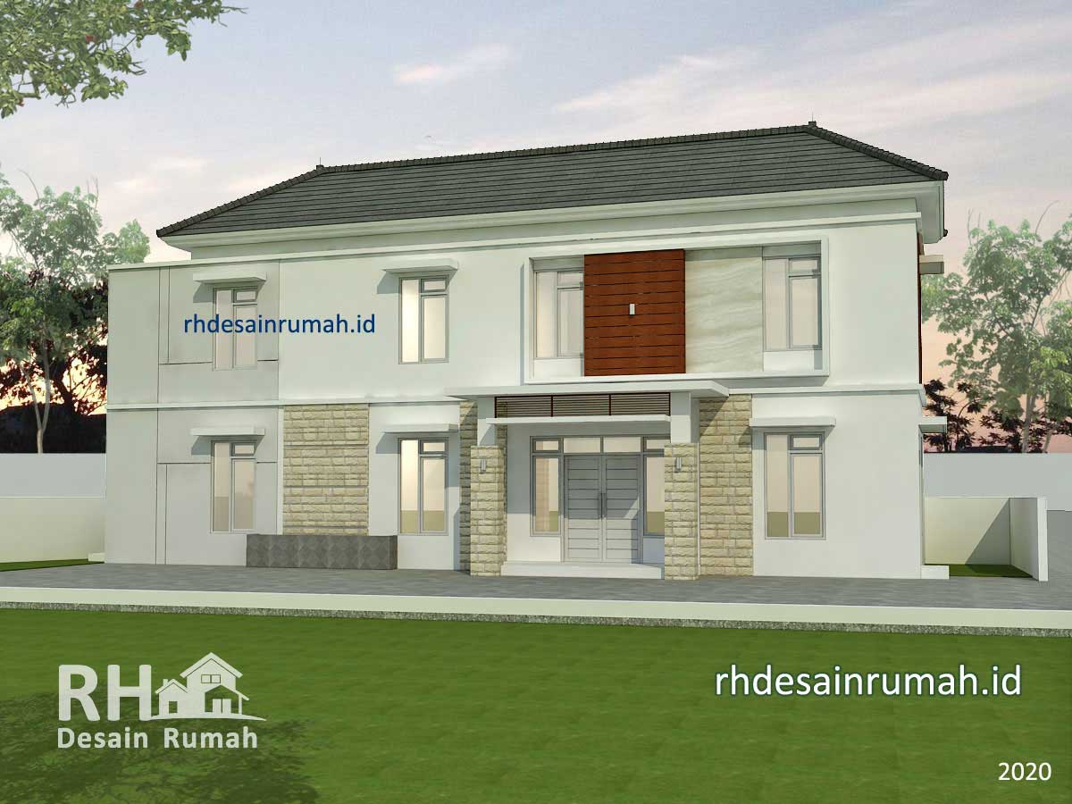 5 Rumah mewah atap limasan 2 lantai warna putih abu-abu elegan, dengan pilar megah nuansa minimalis klasik. Adanya balkon dengan railing warna hitam yang serasi, juga terdapat ornamen roster yang tersembunyi / samar di balik balkon untuk privasi.
