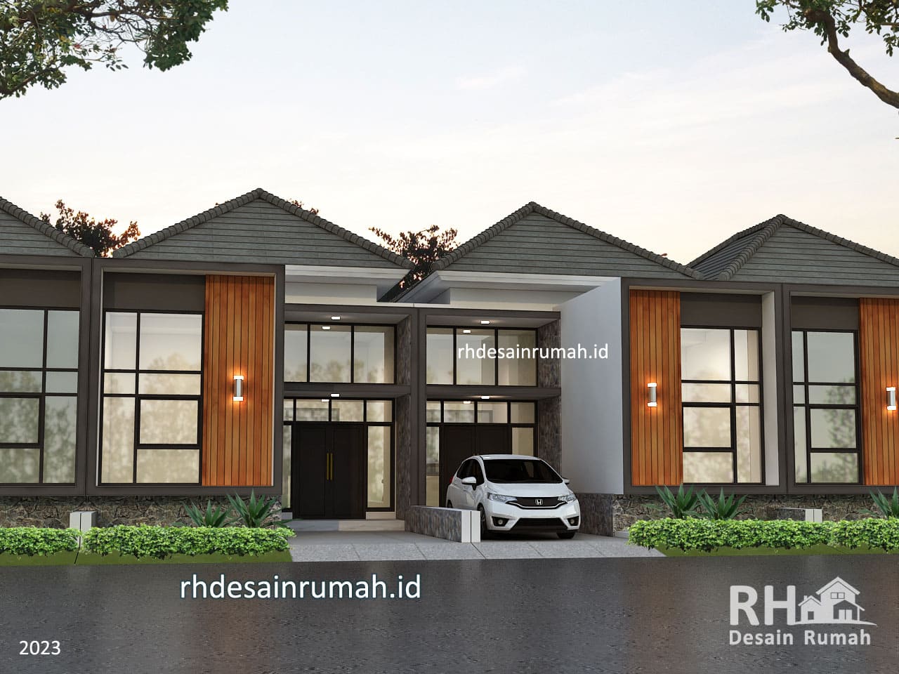 Desain rumah ini memiliki luas 7×14 m dengan halaman yang luas. Luasnya halaman yang ada memungkinkan rumah ini memiliki pintu samping, taman mini serta carport. Aksen cokelat dengan sentuhan batu alam Andesit yang berdekatan dengan lampu hias memberi kesan mewah dan elegan yang sangat menonjol. Penggunaan pintu kupu tarung dan atap Limasan yang besar memberi rumah tampilan yang megah.
