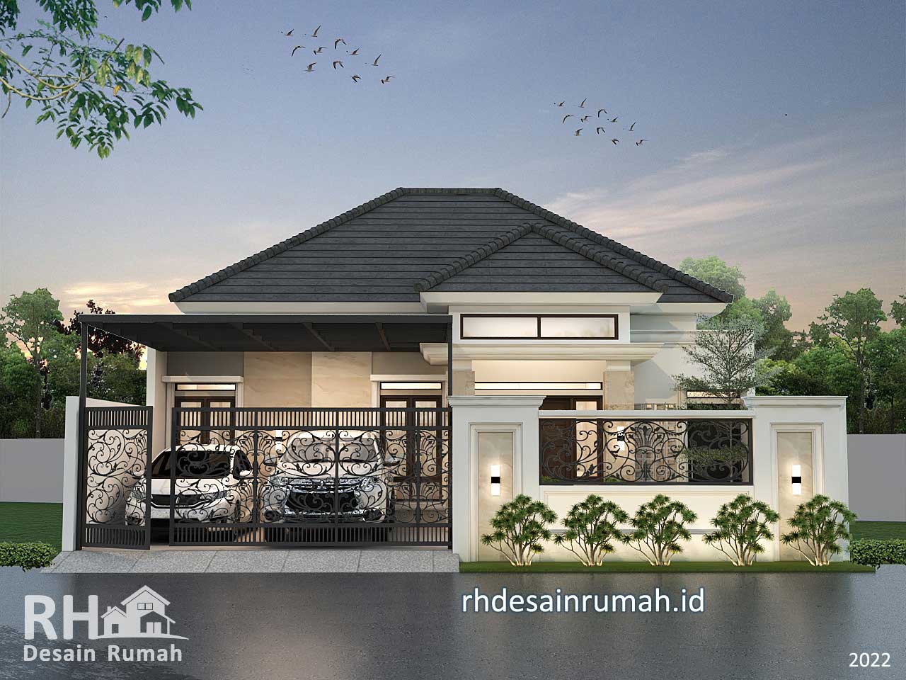 15 Rumah minimalis klasik atap limas dengan balkon, carport muat hingga 2 mobil. Terdapat pilar megah dan ornamen list motif klasik yang menawan, didukung dengan lampu-lampu medieval yang memberikan nuansa hangat, cocok untuk desain rumah mewah anda.